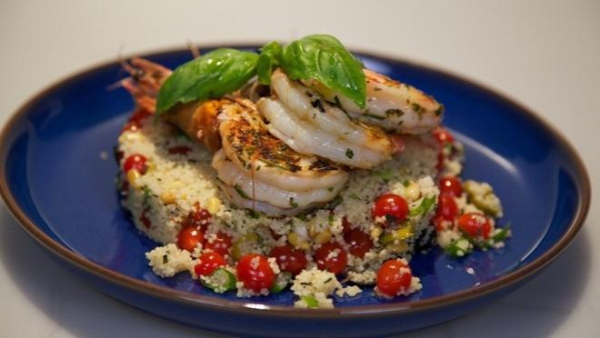 - Gamba-Spies op een heerlijk frisse tabouleh (cous-cous-salade)